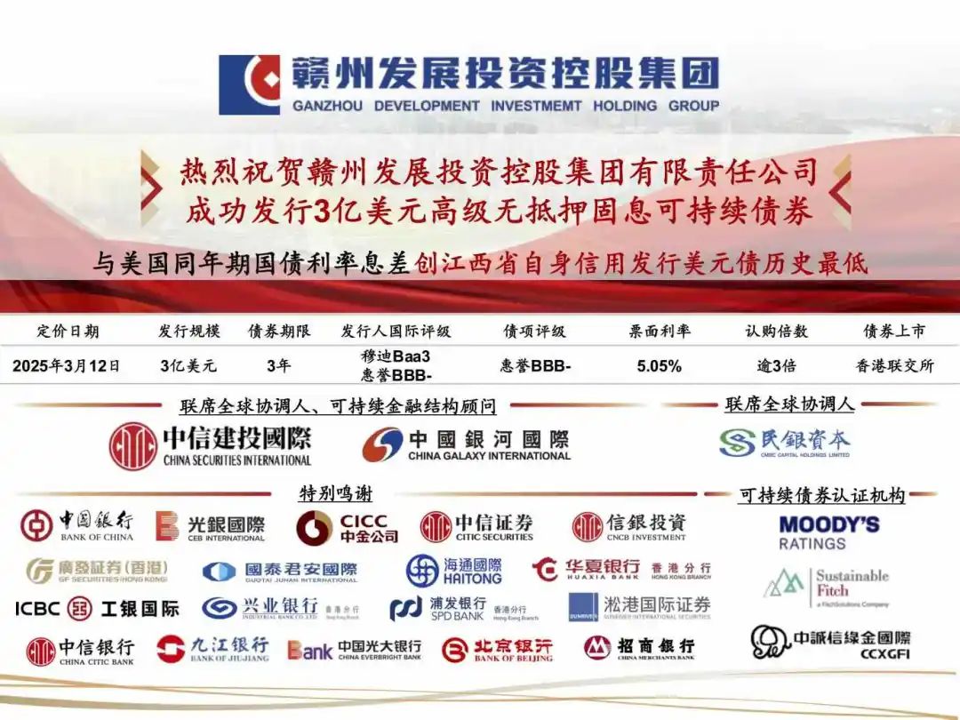 赣州发投成功发行3亿美元可持续发展债券,创江西省国企...